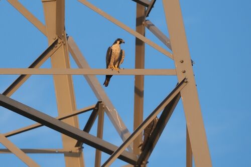 キー、キーという鳴き声に辺りを見まわすと高圧線の鉄塔に声の主~!よくよく見ると2羽、ツガイだろうか~ひょっとして猛禽類、ハヤブサ?こっそり近づいてみると特徴的な目~!白っぽいのと黒っぽいのがいた高速で飛ぶハヤブサは、半透明の「瞬膜」を閉じ眼…